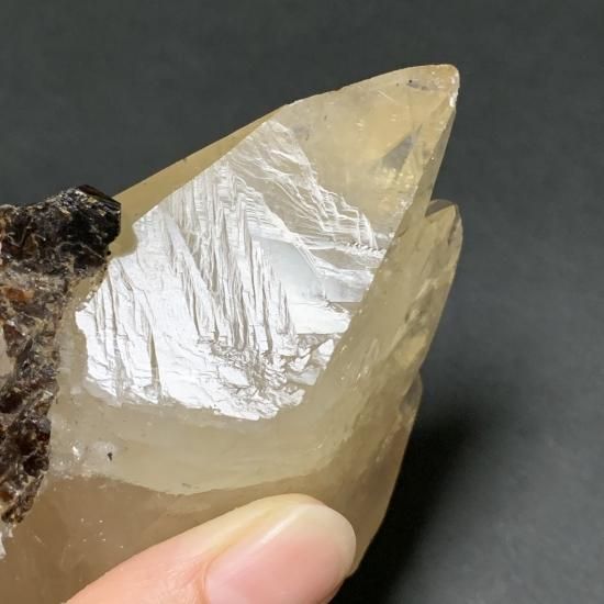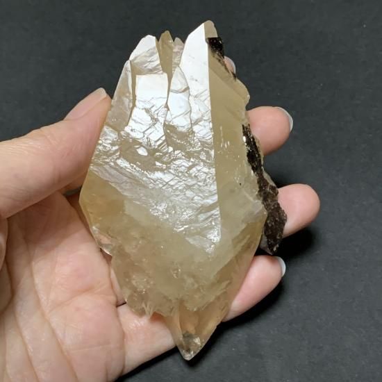 「ステラビームカルサイト」と呼ぶ時、それは通常このような尖った先端をした透明度の高いシトリンのような色のものを指します。