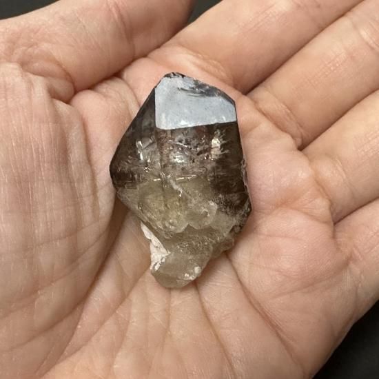 水晶形成の際に、水晶の先端に覆いかぶさるように水晶が形成されてそのまま個体となったものです。子宝のお守りにされていたようですが、先端にエネルギーが宿り、次のステップへと移行する、新しく産み出していくパワフルなクリスタルです。